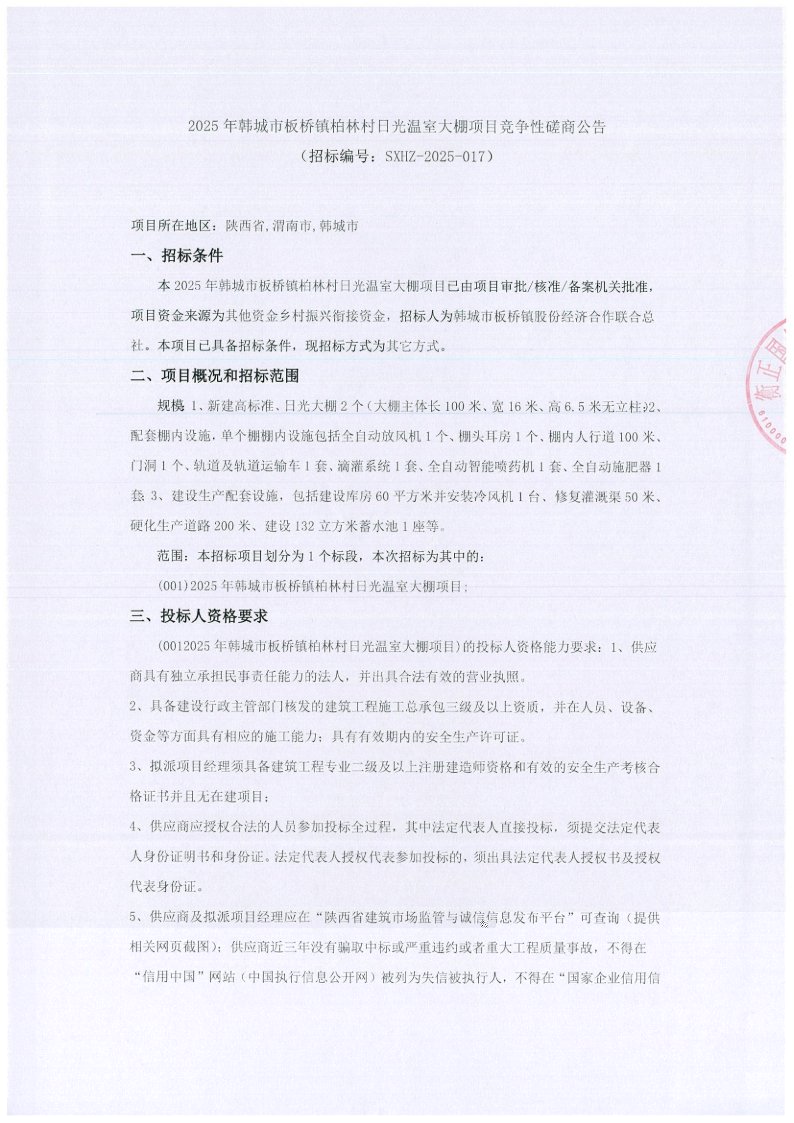 2025年韩城市板桥镇柏林村日光温室大棚项目竞争性磋商公告